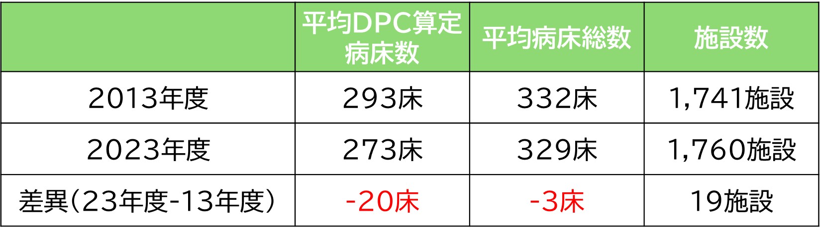 そのような変化は、DPC参加施設の病床数にも表れている。2013年度と2023年度の平均DPC算定病床数、平均病床総数、施設数を比較した=表=。