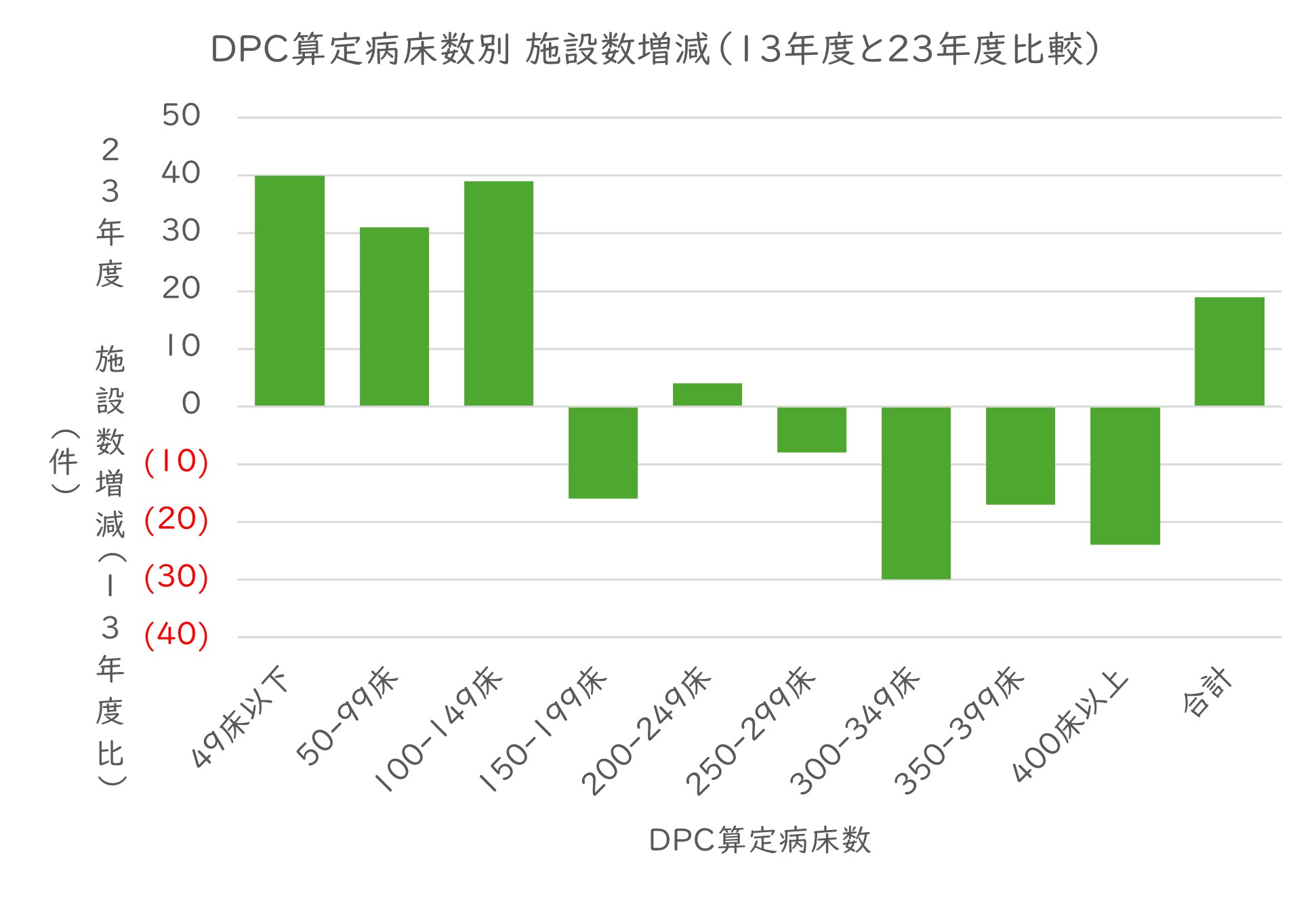 グラフ2 DPC参加病院のDPC算定病床数別施設数増減(2013年度と2023年度の比較)