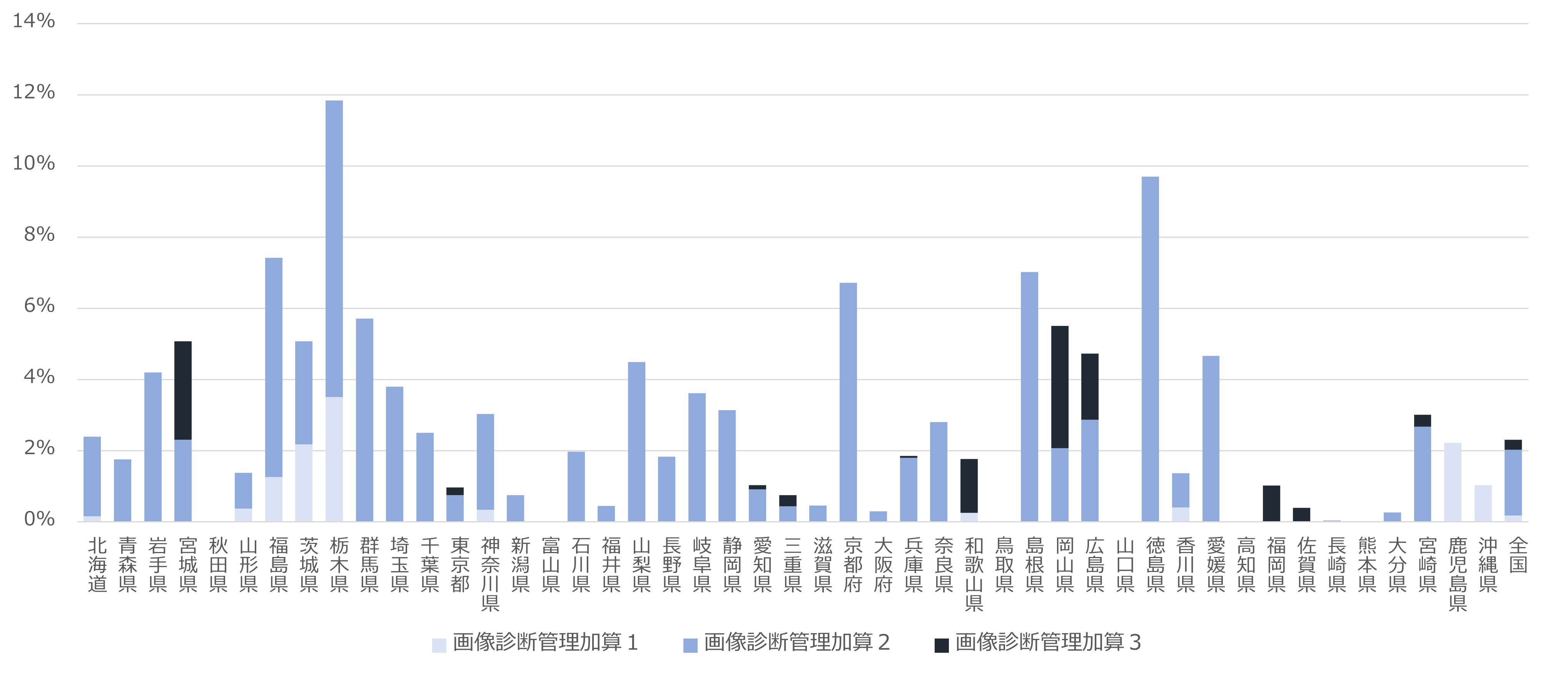 都道府県別では、栃木県が最も遠隔画像診断による算定割合が高く、唯一10%を超えていた。栃木県は加算1の割合が高いことも特徴的だ。加算3による算定は、岡山県、宮城県、広島県、和歌山県など、一部の地域で算定率が高くなっている。一方で、秋田県、富山県、鳥取県、山口県、高知県、熊本県の6県は0%(年間10件未満は0として表示)だった。