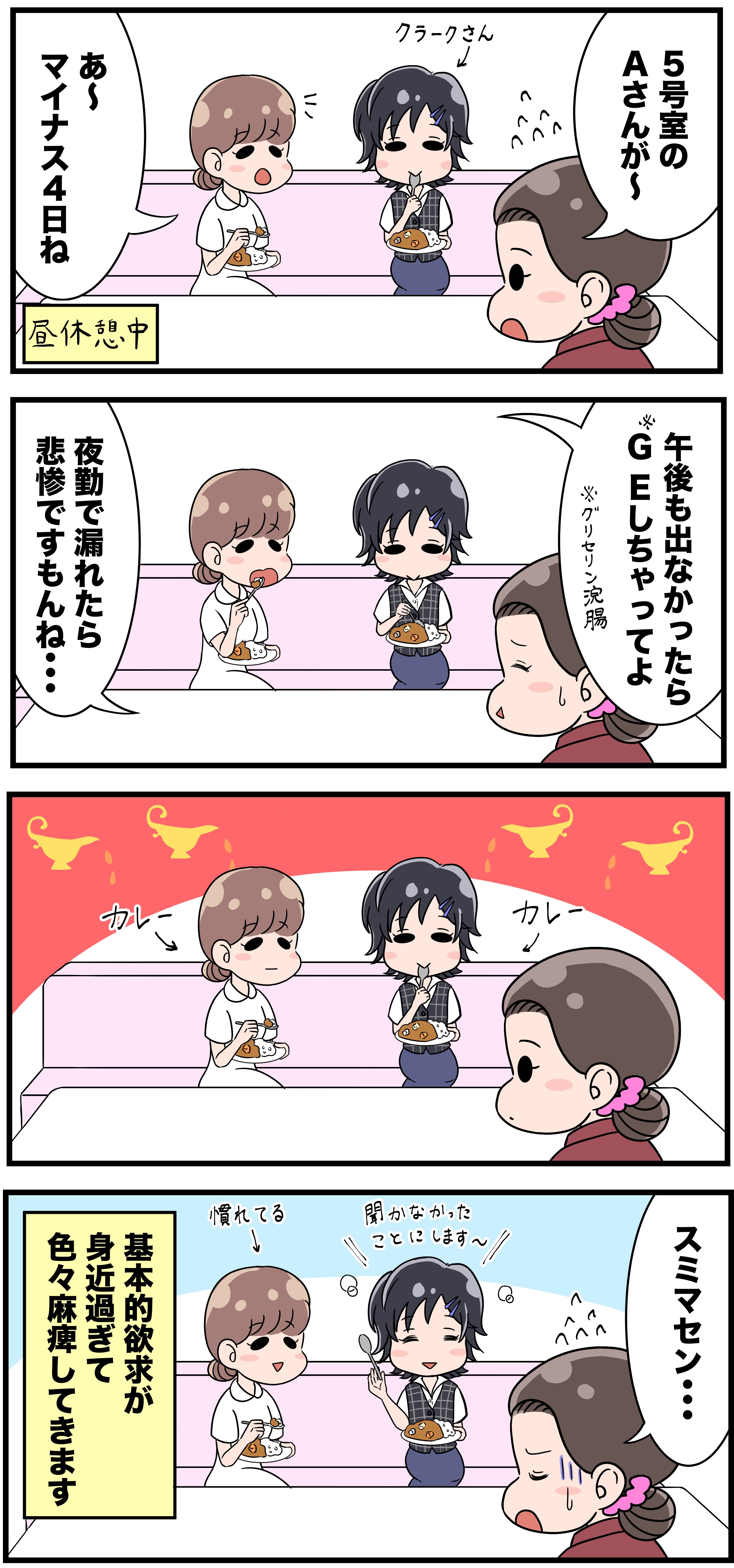 臨床では患者さんの基本的欲求を満たすことが大切な看護です。 しかし、カレーを食べながらする話ではないことをポロッと話してしまい、他職種の方に苦笑いされてしまうこともあります。