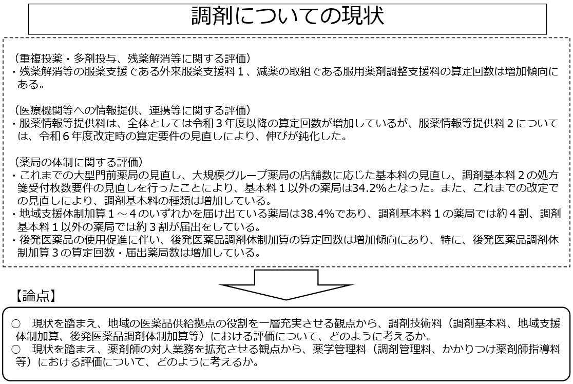 - 地域の医薬品供給拠点の役割を一層充実させる観点から、調剤技術料(調剤基本料、地域支援体制加算、後発医薬品調剤体制加算等)における評価をどのように考えるか。