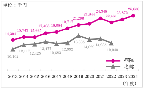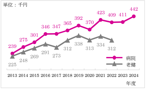 独立行政法人福祉医療機構(WAM)が毎年公表しているリサーチレポートでは、2024年度の病院建設費用の平米単価は442千円(前年度比+31千円)、定員1人当たり建設費用は25,656千円(前年度比+1,784千円)とされ、平米単価では2015年度と比較して1.5倍になっています。