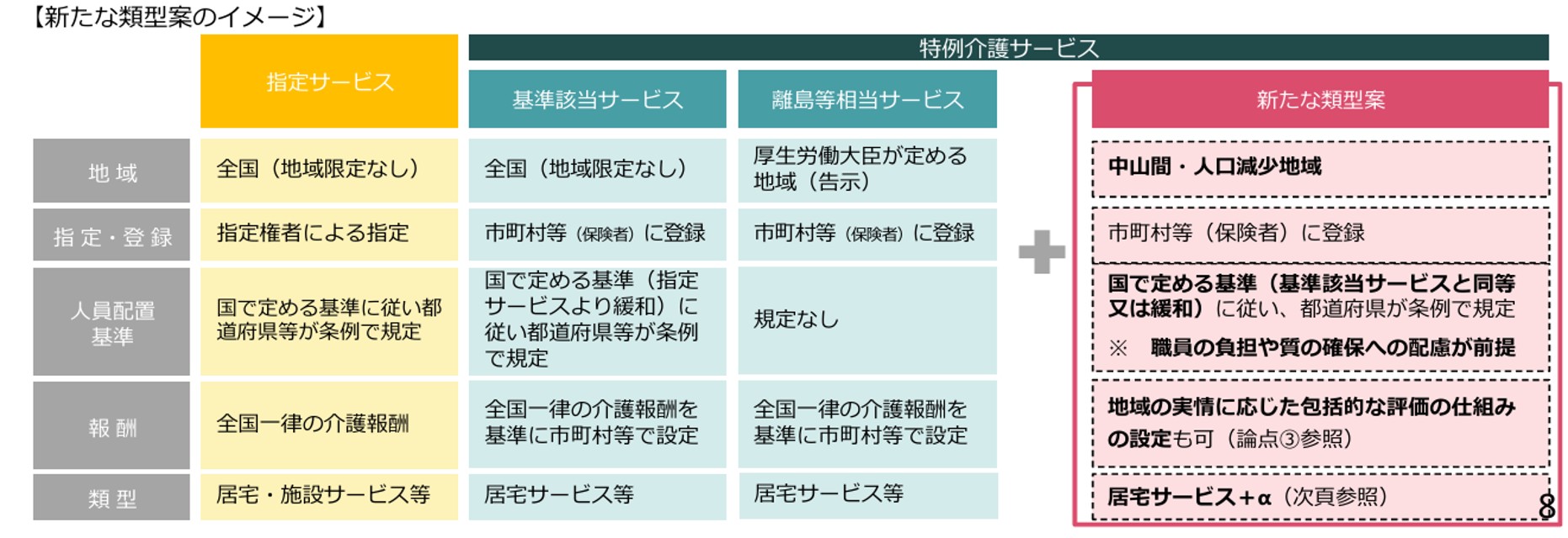 従来より特例介護サービスとして、 「基準該当サービス」 と 「離島等相当サービス」 がありました(図)。ただし、指定・登録、報酬、類型などは、基本的には国の基準をもとに各市町村が決める方式で、あくまでも国の基準がベースにありました。しかし、今回提案された 「新たな類型」 では、中山間・人口減少地域において、ICTや事業所連携を前提 として人員の基準緩和を設ける、包括報酬を導入するなど、今までよりも踏み込んだ基準が示されています。
