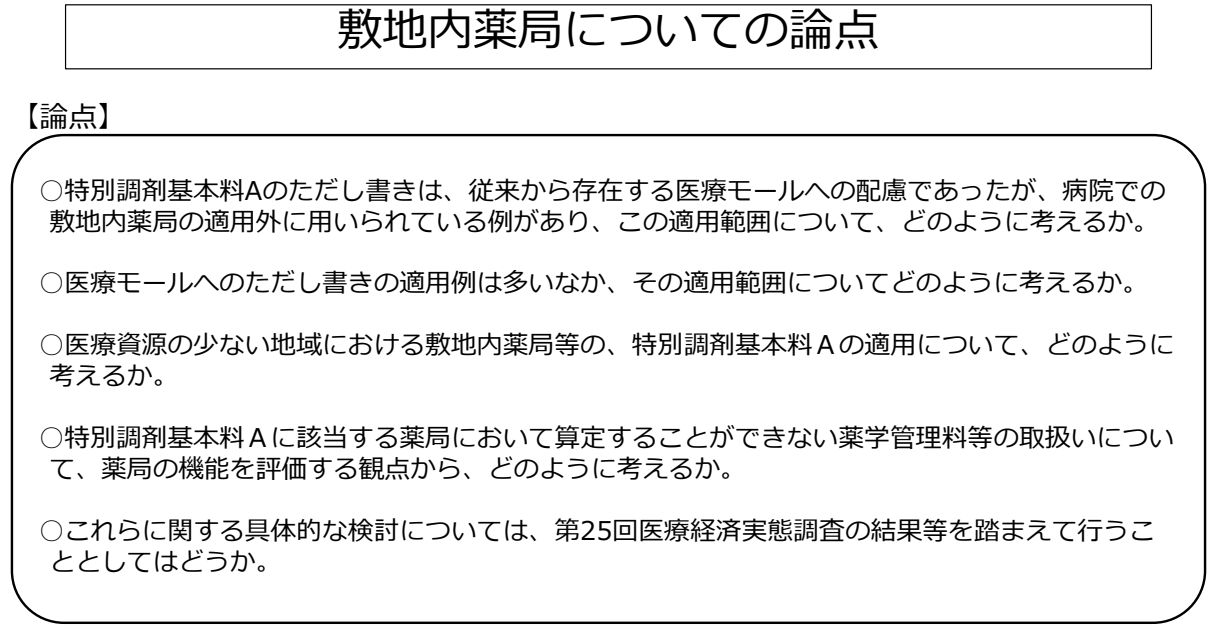 こうした実態を鑑みて、除外規定の廃止を検討すべき、という声が上がっている。日本薬剤師会は、従来からあるものを守る除外規定は一定の役割を担っており、それを逸脱するケースへの報酬上の厳格化や是正を求めた。一方、日本医師会や健保連からは廃止を検討すべきという声が強く、実態を細かく区別する案を示さなければ、従来の医療モール型薬局が大きな打撃を受ける可能性がある。