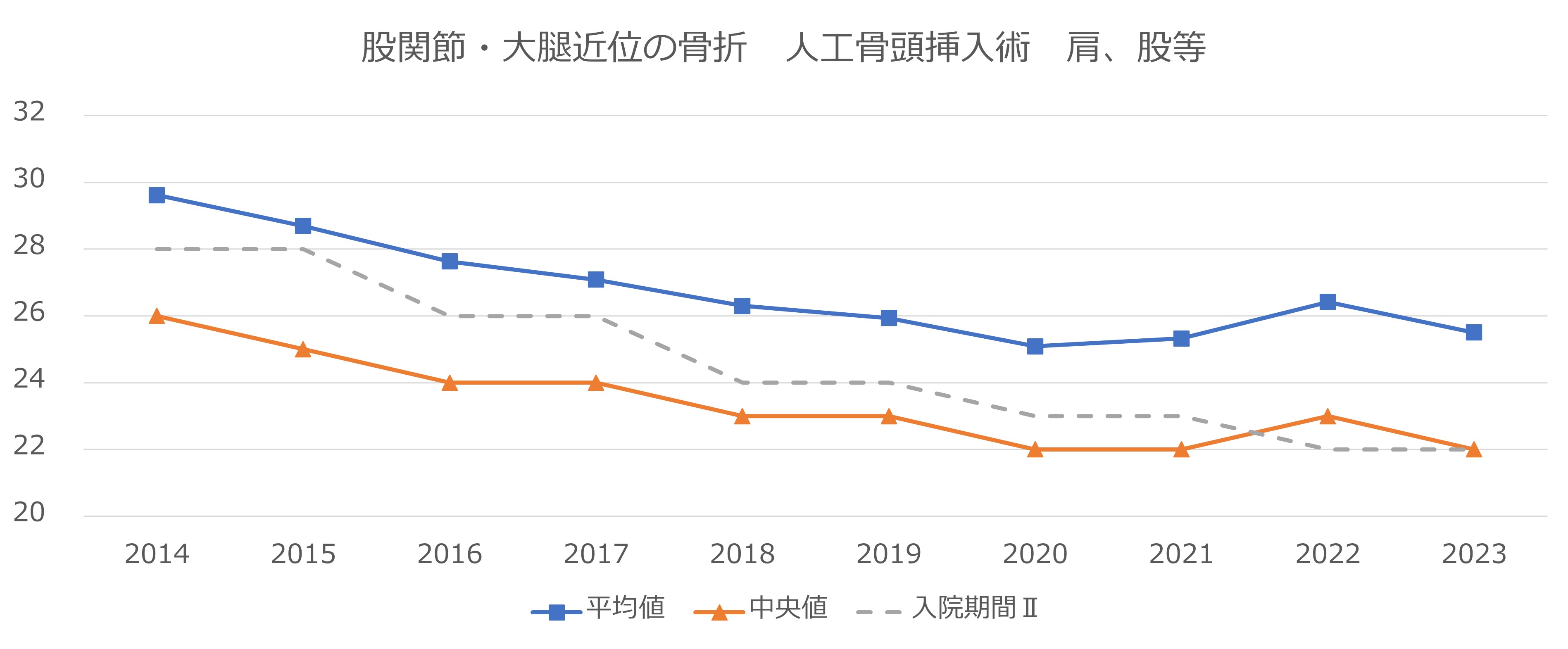 「160800xx01xxxx(24年制度では160800xx02xxxx):股関節・大腿近位の骨折人工骨頭挿入術肩、股等」 を取り上げ、2014年度以降の公開データを用いてDPC対象病院における在院日数の平均値、中央値と各年度に設定されている入院期間Ⅱの推移を図にまとめた。