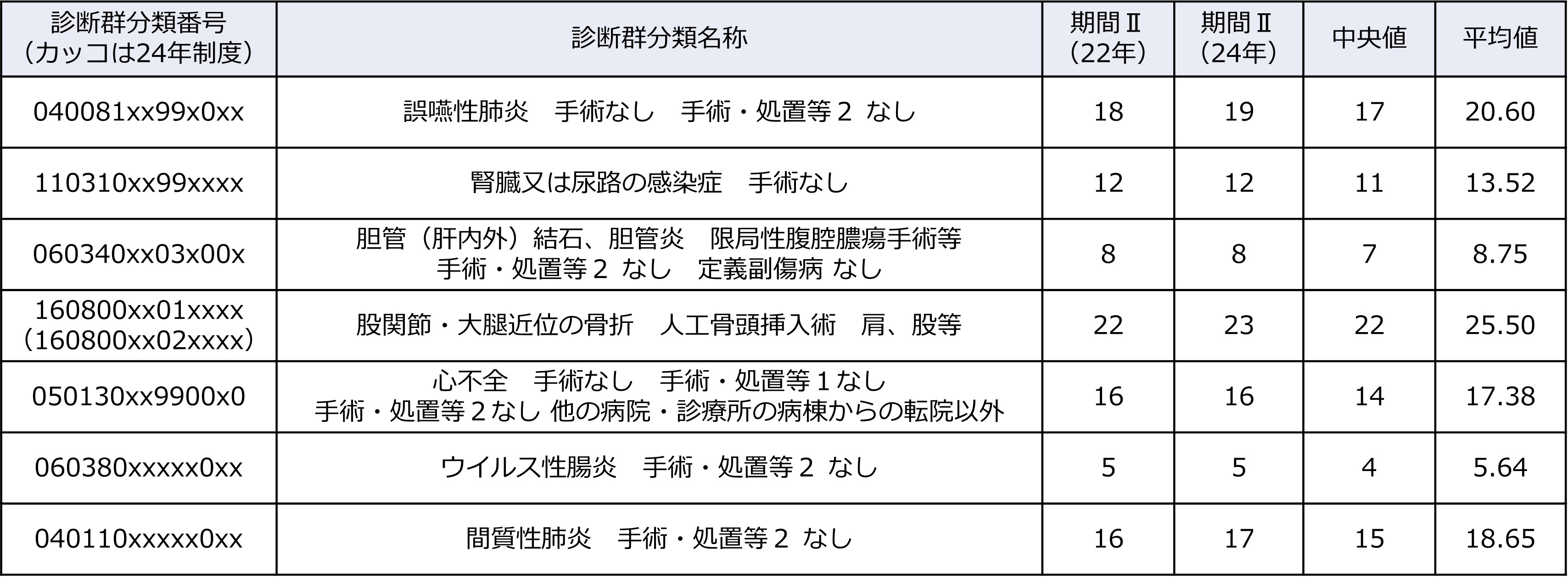 入院期間Ⅱと突き合わせると、DPC対象病院における各診断群分類の平均在院日数という前提のはずだが、必ずしもそうではないことがわかる。「060380xxxxx0xx:ウイルス性腸炎手術・処置等2 なし」 は平均値5.64日に対して、入院期間Ⅱは5日となっており、前提に基づく日数設定といえる。しかし、「040081xx99x0xx:誤嚥性肺炎 手術なし 手術・処置等2 なし」 は平均値20.60日に対して、2022年制度18日、2024年制度19日となっており、平均値と比較して1日以上の差が生じている。「160800xx01xxxx:股関節・大腿近位の骨折人工骨頭挿入術 肩、股等」 にいたっては、平均値25.50日に対して、2022年制度22日、2024年制度23日となっており、3日前後の差が生じている。むしろ中央値の方が近い。
