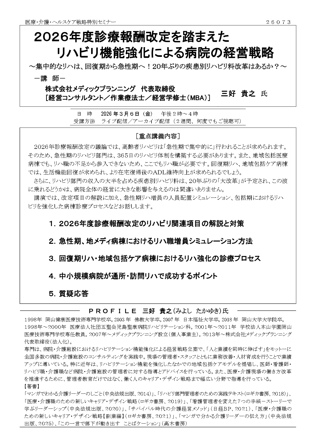 2026-01-26【セミナーのご案内】2026年度診療報酬改定を踏まえたリハビリ機能強化による病院の経営戦略